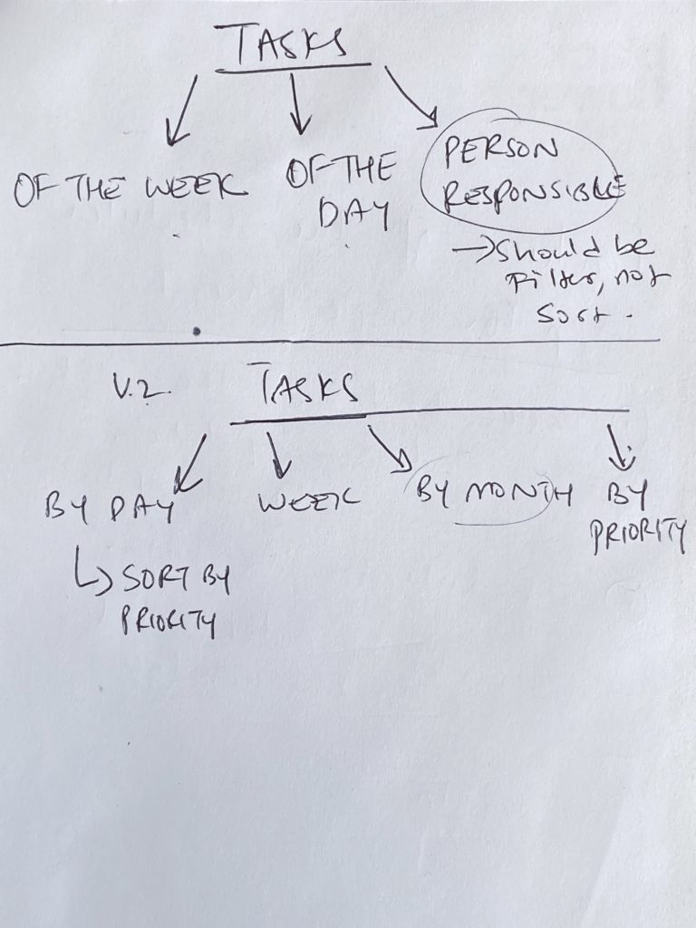 • Screen 2: tasks should say ‘tasks for the day.’ We don’t need to sort by day, week or month (that was my initial idea), as calendar can take care of that. So let tasks be default as to show only for the day.