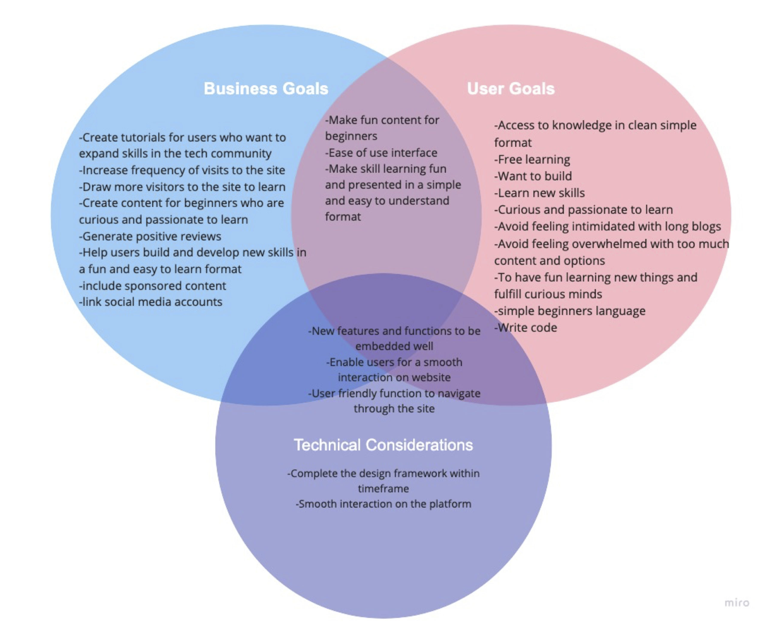 I created a Venn diagram to summarize and align the vision of the company, needs of their users and the technical considerations in getting this live and functioning at the earliest.