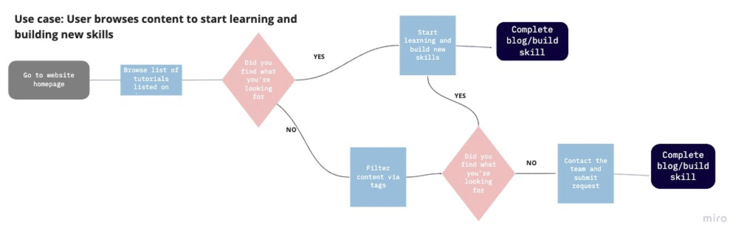 I started with building a sitemap to get a clear direction of how the website will function and then created a user flow to define the steps visiting users would take in order to browse and view tutorials.