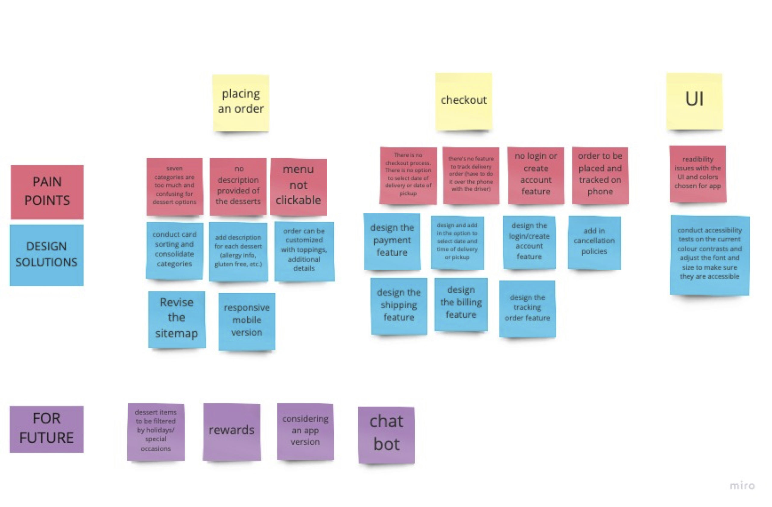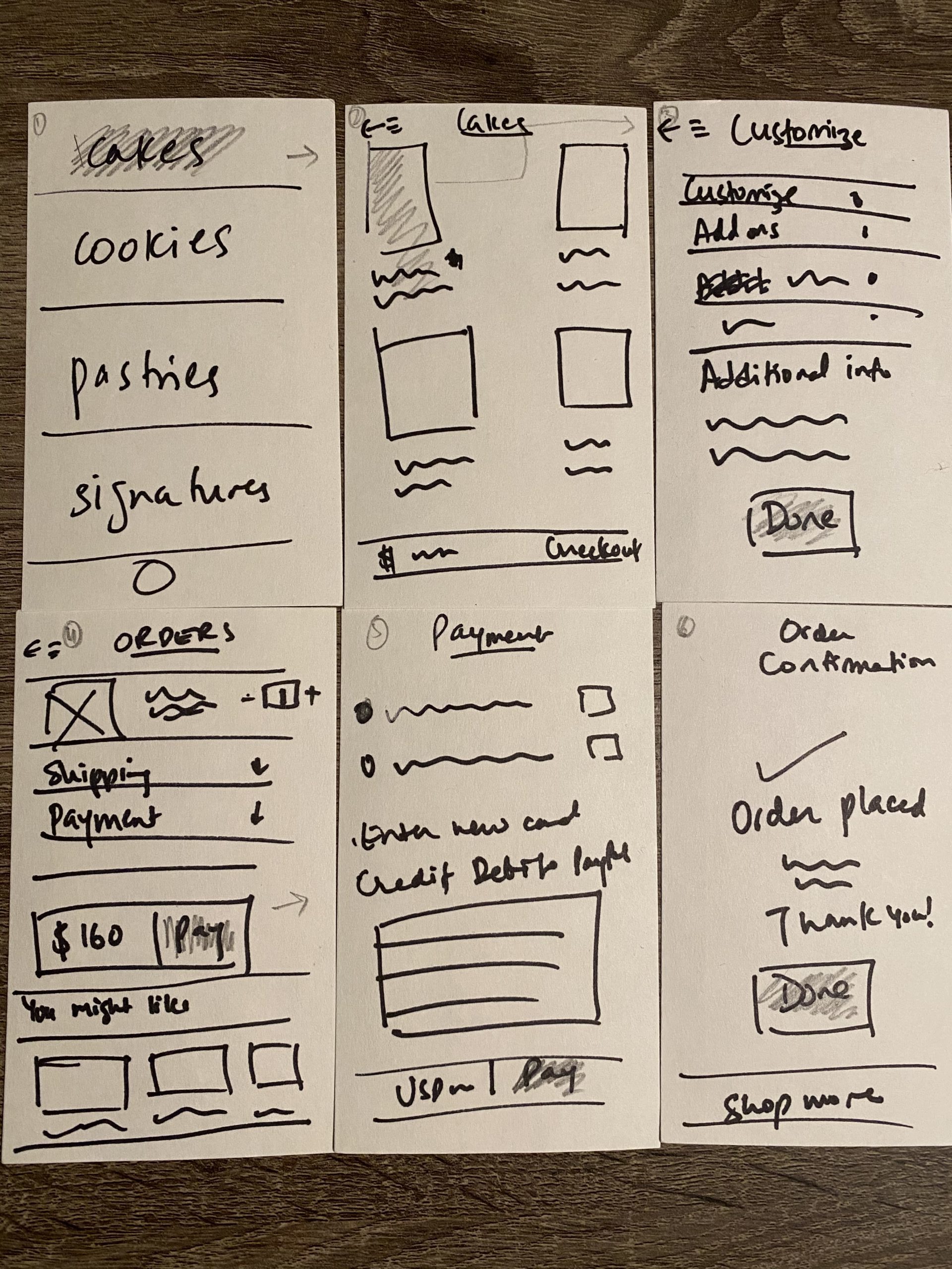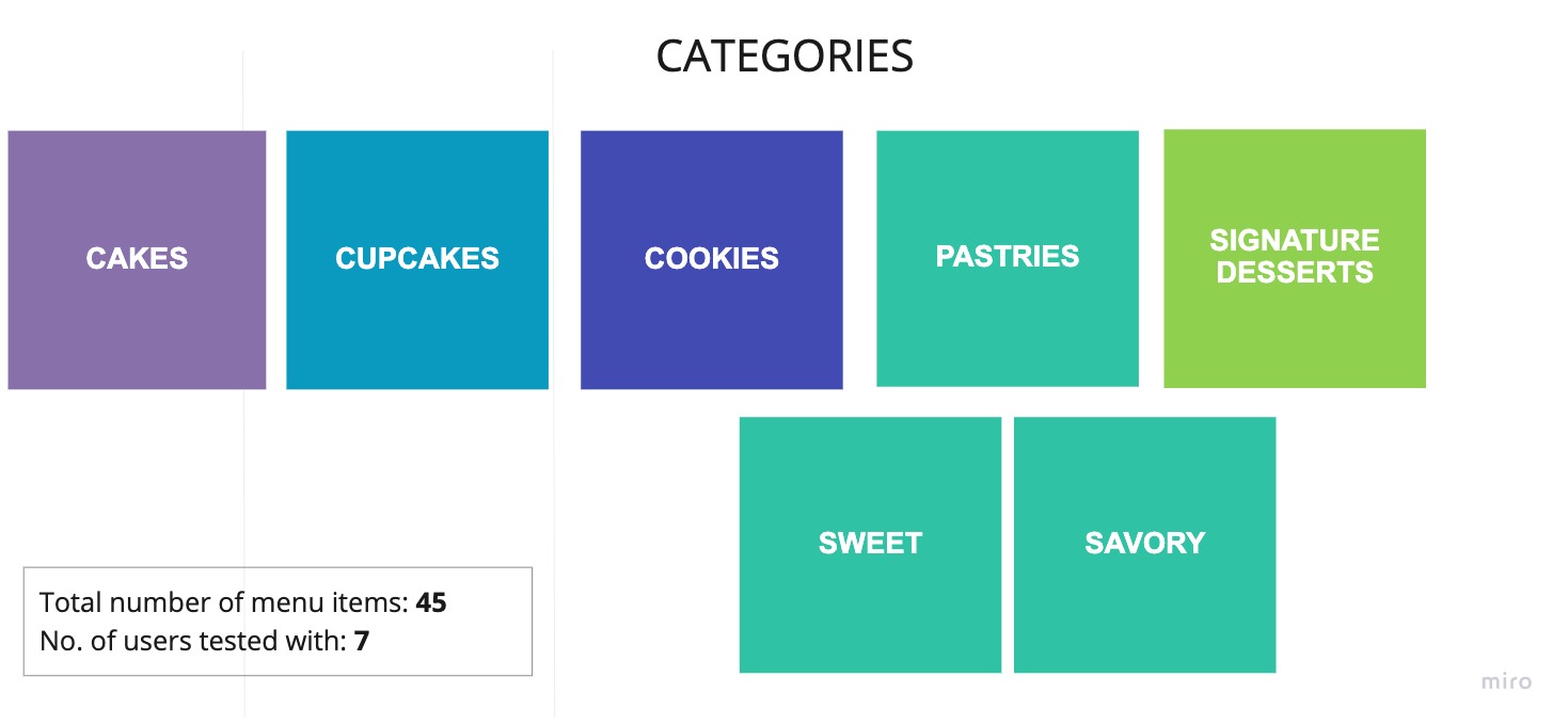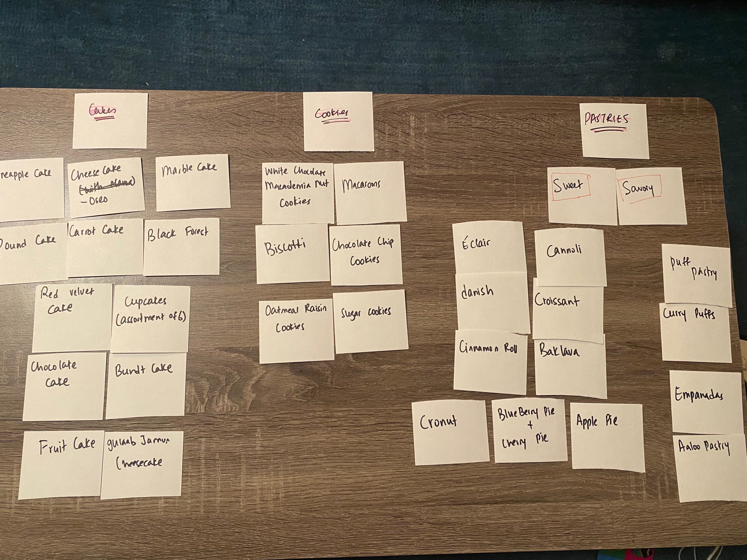 Since we were time-bound and low on budget, we researched how other bakeshops categorized their menu, and then conducted an open card sort among our team and came up with 5 categories.