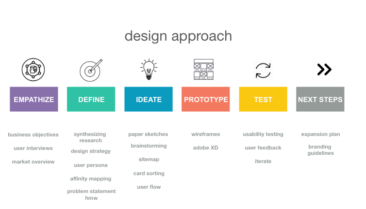 Client research, in-person qualitative user interviews, competitor analysis, synthesizing data, design strategy, user personas, feature prioritization, card sorting, sitemap, user flows, wireframes, mid-fidelity prototype, guerrilla usability testing, contextual inquiry, brand style guide.