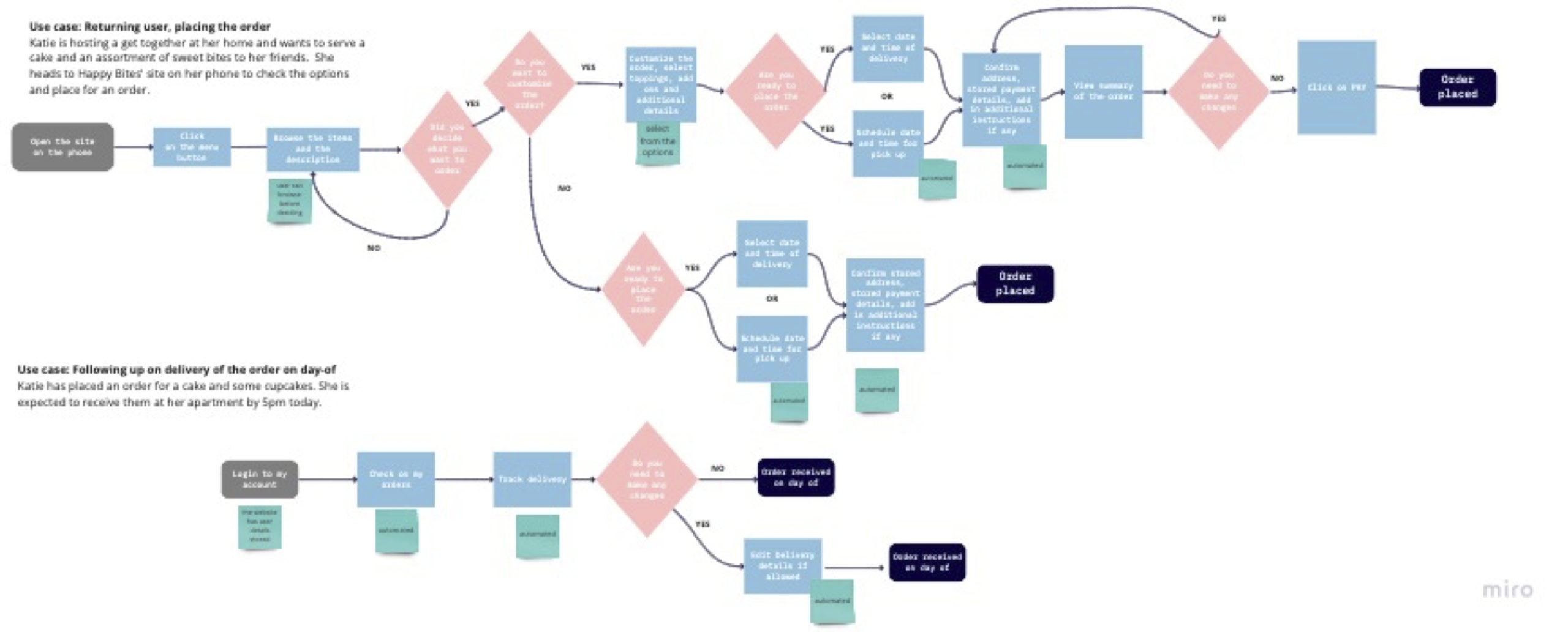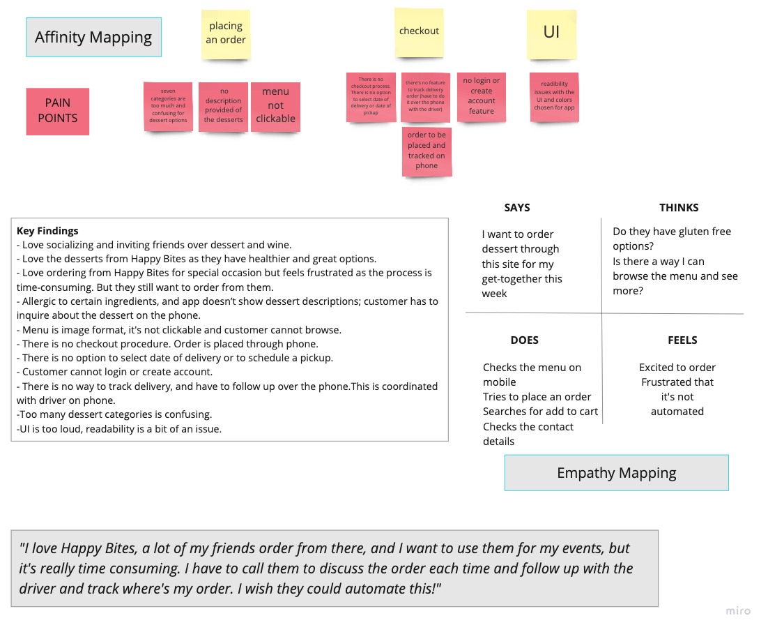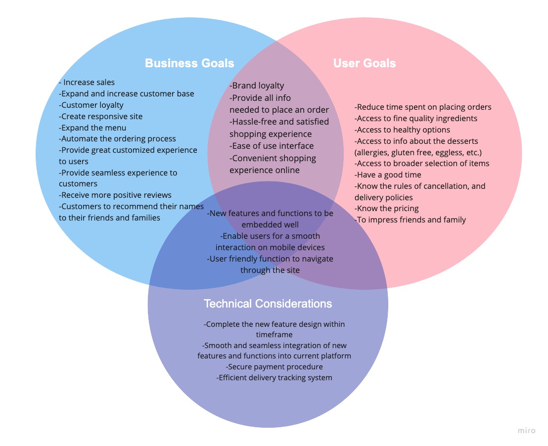 I created a Venn Diagram to reflect and align business, users and technical goals for Happy Bites. We wanted to make sure we’re advocating for the user to create the best user experience possible, while acting in the best interest of the client.