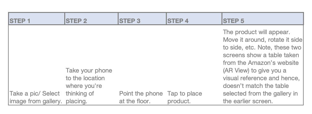 Step 5: The product will appear. Move it around, rotate it side to side, etc. Note, these two screens show a table taken from the Amazon’s website (AR View) to give you a visual reference and hence, doesn’t match the table selected from the gallery in the earlier screen.